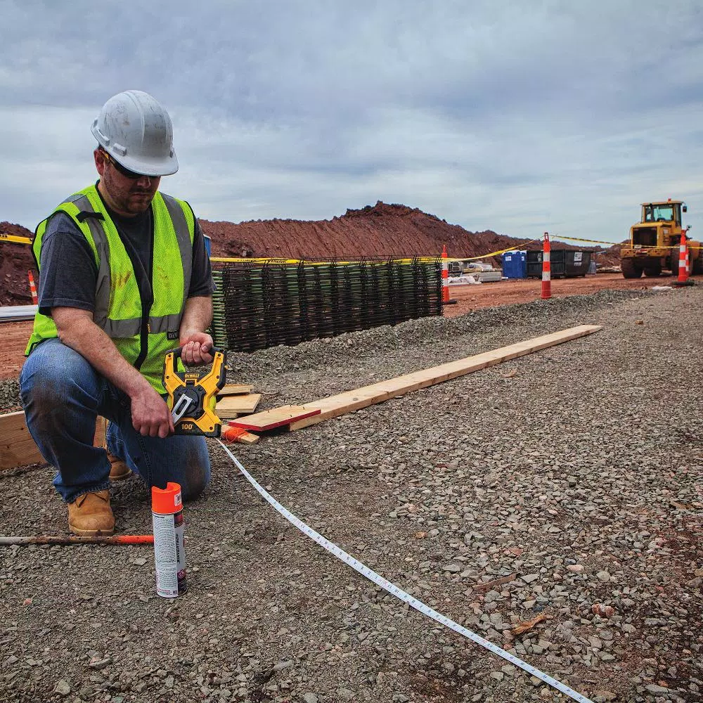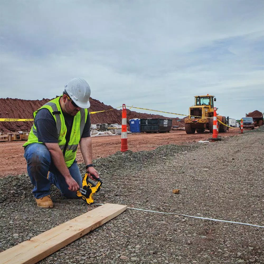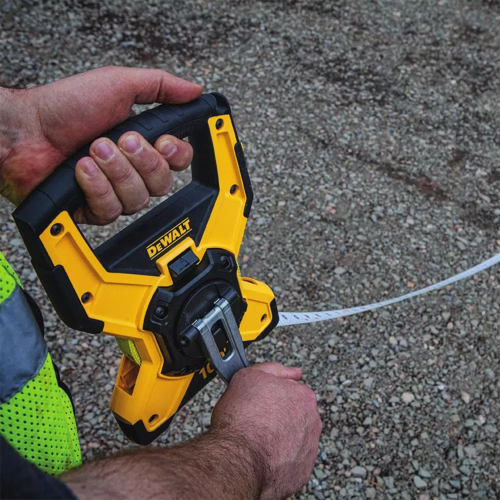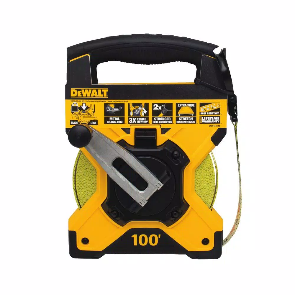 This heavy-duty 100 ft. L measuring tape is designed for durability and ease of use on any job site. The rugged open case design features rubber over molding to improve ergonomics and impact resistance while also allowing dirt, mud or any other foreign objects to be easily removed from the tape blade. The measuring blade itself is in. wide with large numbers and a yellow background for easy readability and features 64-fiberglass strands to increase life and reduce stretching over time to ensure accuracy.