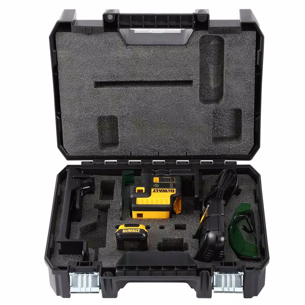 Introducing DEWALTβs new 12-Volt Compatible GREEN 5 Spot Laser. This laser features 5 total beams and is built to last. Included is the laser itself along with an, extended ceiling bracket, target card and enhancement glasses. Itβs green beam provides enhanced visibility and extended range.