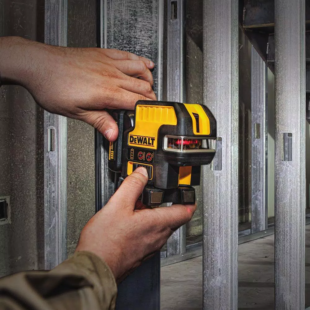 Introducing DEWALTβs new 12-Volt Compatible RED Cross-line plus 2 Spot Laser. This laser features 4 total beams (2 spots and 2 lines) and is built to last. Included is the laser itself along with an AA Starter pack, extended ceiling bracket, target card and enhancement glasses.