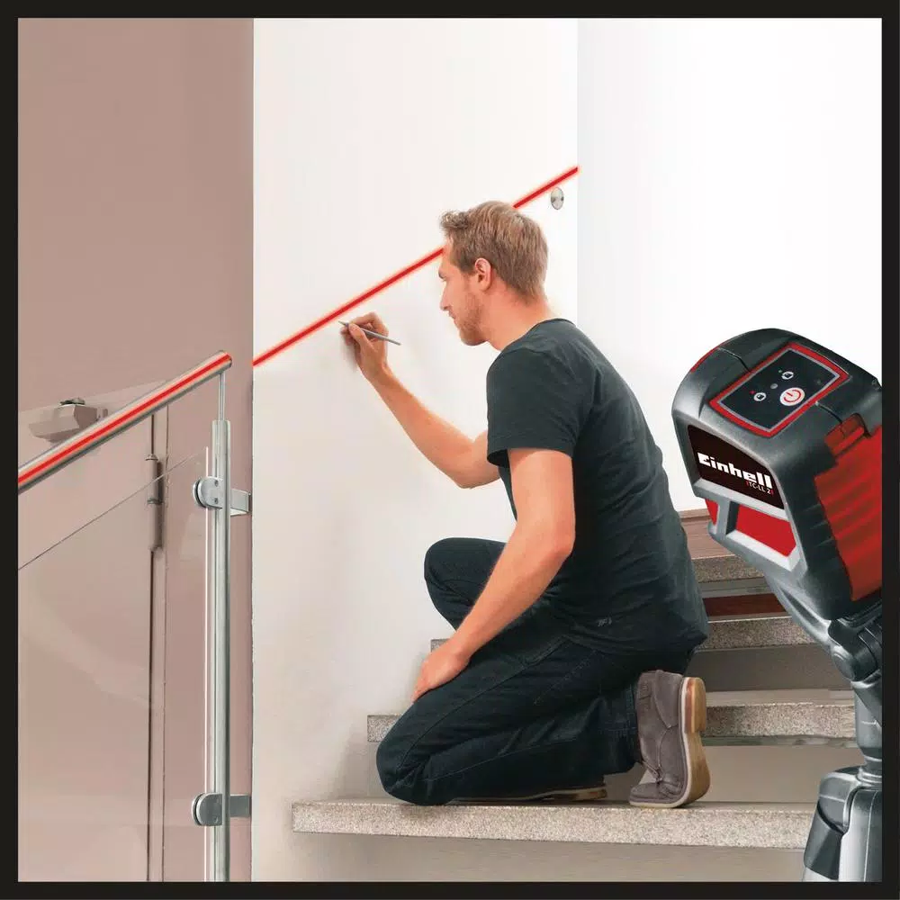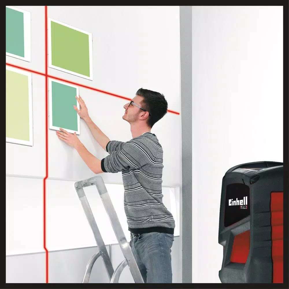 The Einhell cross laser level TC-LL 2 makes it easy to project a laser cross and single laser lines onto walls, floors, ceilings or workpieces. Using the cross laser level you can align tiles, edgings, wallpaper and objects with meticulous accuracy. Angular placement on surfaces is possible thanks to the universal clamp, enabling you to position nails or drill-hole markers precisely. Another function of the cross laser level is that of a digital spirit level, making conventional measuring tools redundant. This cross laser level also has a self-leveling function, with an LED which warns the user of tilt angles greater than 4°. A 1/4 in. thread is integrated for use on a tripod. Comfortable handling of the cross-line laser is assured by the soft grip. Included in the scope of delivery is a universal clamp for user-friendly and flexible operation as well as a practical bag for storage.