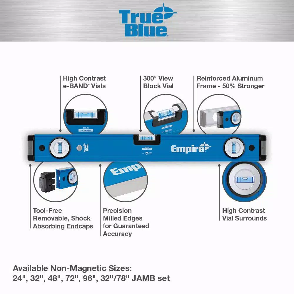 The True Blue e105 Series Digital Level offers accuracy, superior protection and an advanced feature set. With quicker set-up time, Empireโs Digital Levels are engineered to provide fast and accurate readings in 7 different measuring modes and include large, easy to read dual backlit displays. For added durability, the True Blue Digital Level is IP65 rated to protect against dust and water as well as extreme jobsite conditions. All 24 in. plus Digital Levels come with a protective storage case. The Empire 8 in. True Blue Magnetic Billet torpedo level features True Blue vials that deliver best-in-class accuracy and anodized aluminum, allowing this billet to deliver unparalleled strength and durability. The Empire True Blue Laser Etched 7 in. Rafter Square (e2994) features permanent laser markings for superior readability in any light condition. SCRIBE-GUIDE precision scribe notches allow users to easily mark parallel lines on lumber.