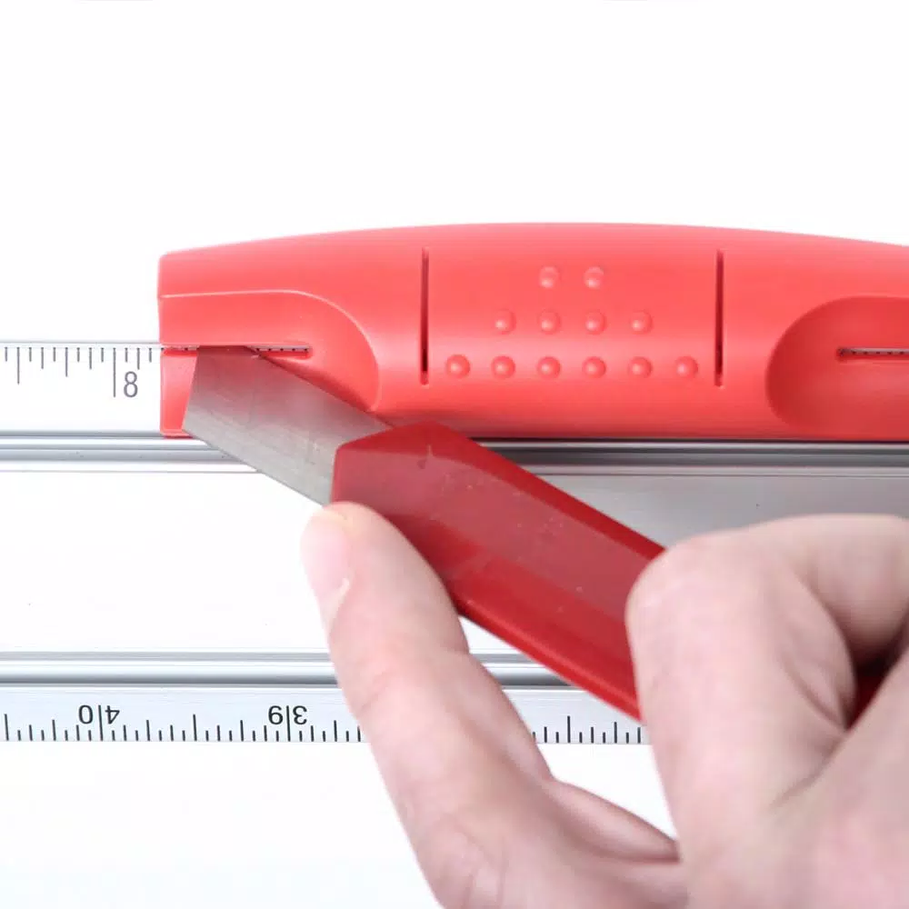 314 Set and Match System is a complete Do-It-Yourself workshop you can custom build to create your own layout and marking tool. Moving the 314 is easy with a sturdy handle which slides along the rulers face and has an integrated auto-lock mechanism which keeps the handle in place for a sure grip. The 314 also has a horizontal and vertical knife guide that smoothly slide along the rulers edge and lock in lace for a safe and accurate cut.