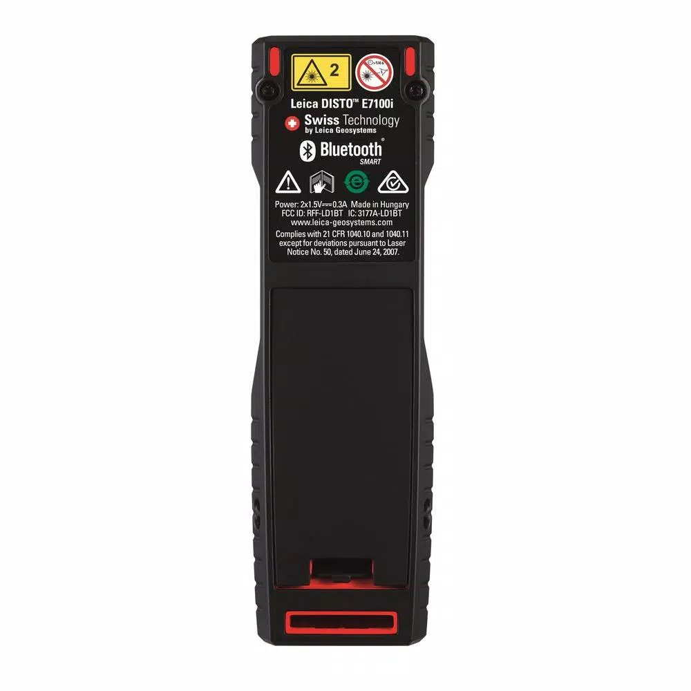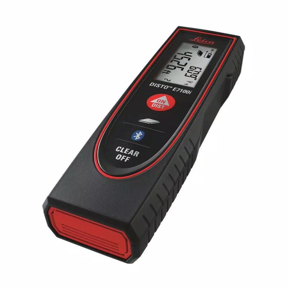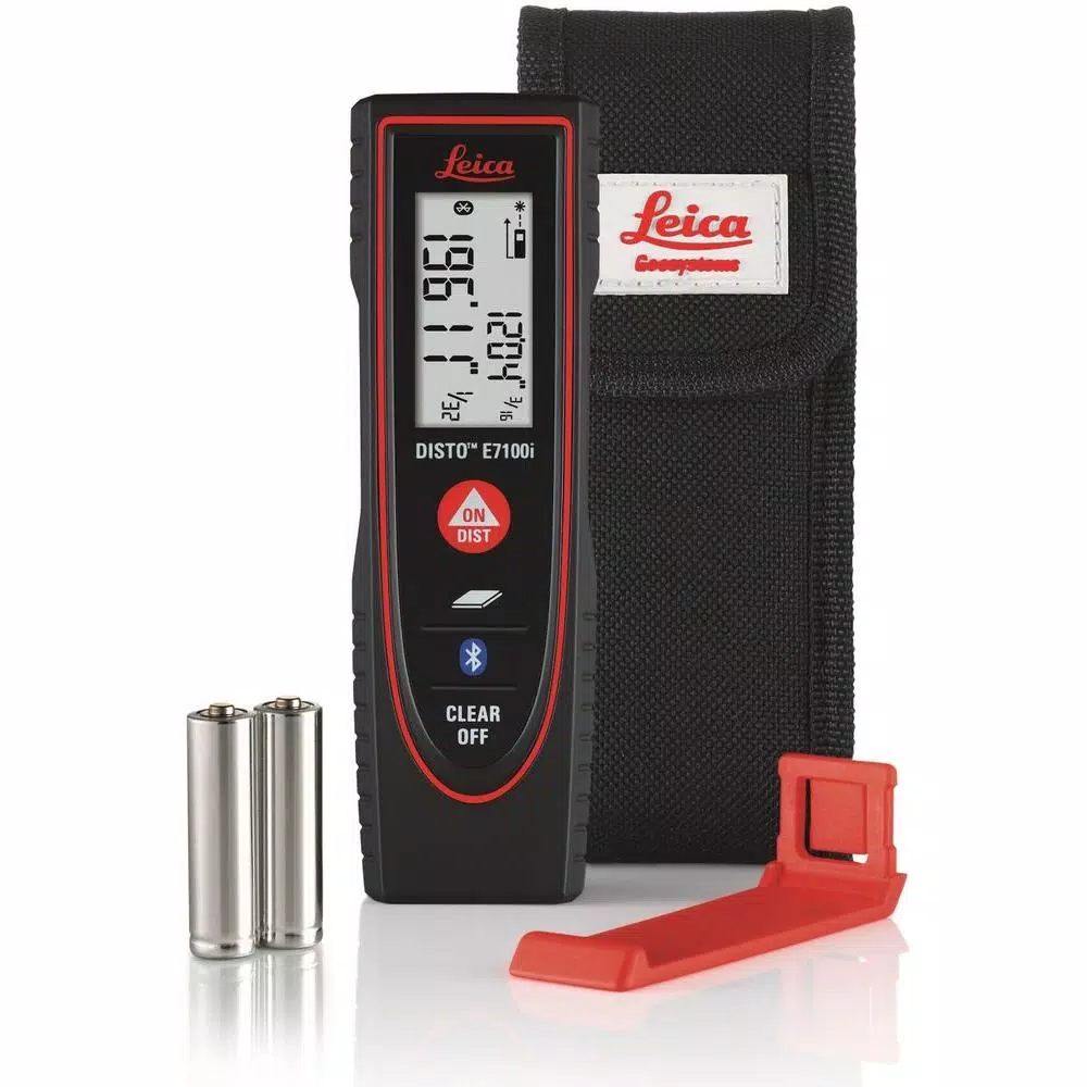 The new Leica DISTO E7100i is the first laser distance meter with Bluetooth Smart that easily fits into your pocket. Measuring just 4.72 in. long, 1.5 in. wide, 0.9 in. thick and weighing in at 3.25 oz., it not only fits in your pocket but also in your personal bag or tool pouch with ease. Whether you need a quick material estimation or you work on a home improvement project, the Leica DISTO E7100i with integrated Bluetooth Smart and the free Leica DISTO sketch app offers you endless possibilities to create sketches, generate floor plans, or document your measurements with pictures using a Smartphone or a tablet and the free apps. Additional apps that integrate the DISTO may be found from your favorite 3rd party developers as well. This unit measures up to 200 ft. with 1.5 mm (1/16 in.) accuracy. Features include 2 line back light display, area calculations and continuous measuring mode. Units of measure include your choice of feet/inch/fractions, inch/fractions, decimal feet and metric. Itβs powered with 2 AAA batteries and includes a lanyard and nylon pouch.