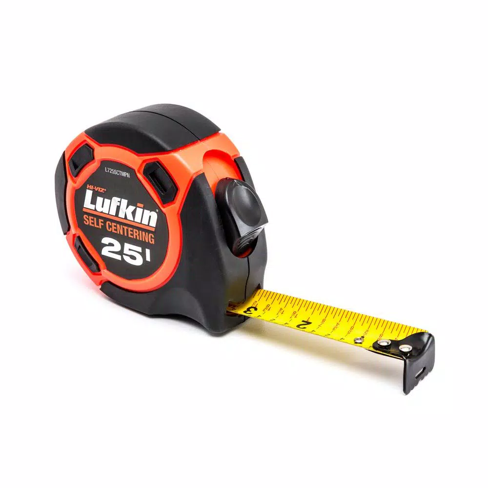 The Lufkin 25 ft. Tape Measure prominently displays the halfway point of a measured distance, saving you the trouble of calculating fractions. This specialized, self-centering device has a row of black numbers representing an object’s measurement, while a row of red numbers directly opposite represents the center measurement. The lightweight, high-strength, contour-grip case is designed to comfortably fit in any users hand.