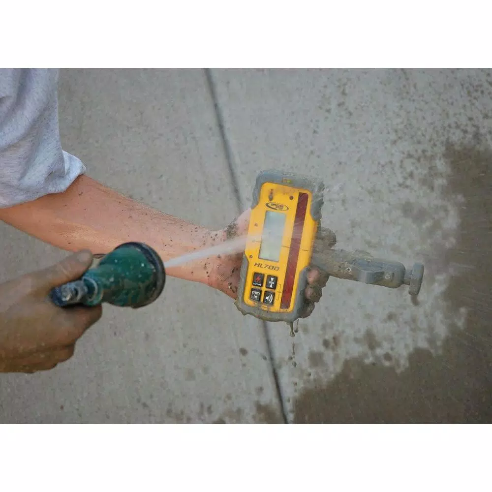 The Spectra Precision HL700 Laserometer is a highly versatile laser receiver for basic and advanced leveling and aligning applications. The receiver works with any red beam rotating laser and is designed for all contractors. The HL700 is an easy-to-use tool that accurately measures elevations across the site. Featuring a digital readout of elevation, the receiver provides a numeric display of Β± 2 in. The digital readout is displayed on the large front and rear LCDs and shows exactly how far the elevation is from on-grade. Accurate measurements can be made without moving the rod clamp, saving time and increasing productivity. Selectable units of measure can be displayed meeting your application and include feet, inch or fractional inches, as well as metric units. A 5 in. reception height, more than double the industry standard, allows quick acquisition of the laser beam. An anti-strobe sensor prevents false readings from site strobe lights. The Laserometer receiver is designed to survive the tough construction site conditions; it is totally waterproof and can withstand a drop of 10 ft. onto concrete. The HL700 can be used as either a hand-held or rod mounted receiver for a wide range of applications. Add an HL700 to your existing laser system to increase productivity.
