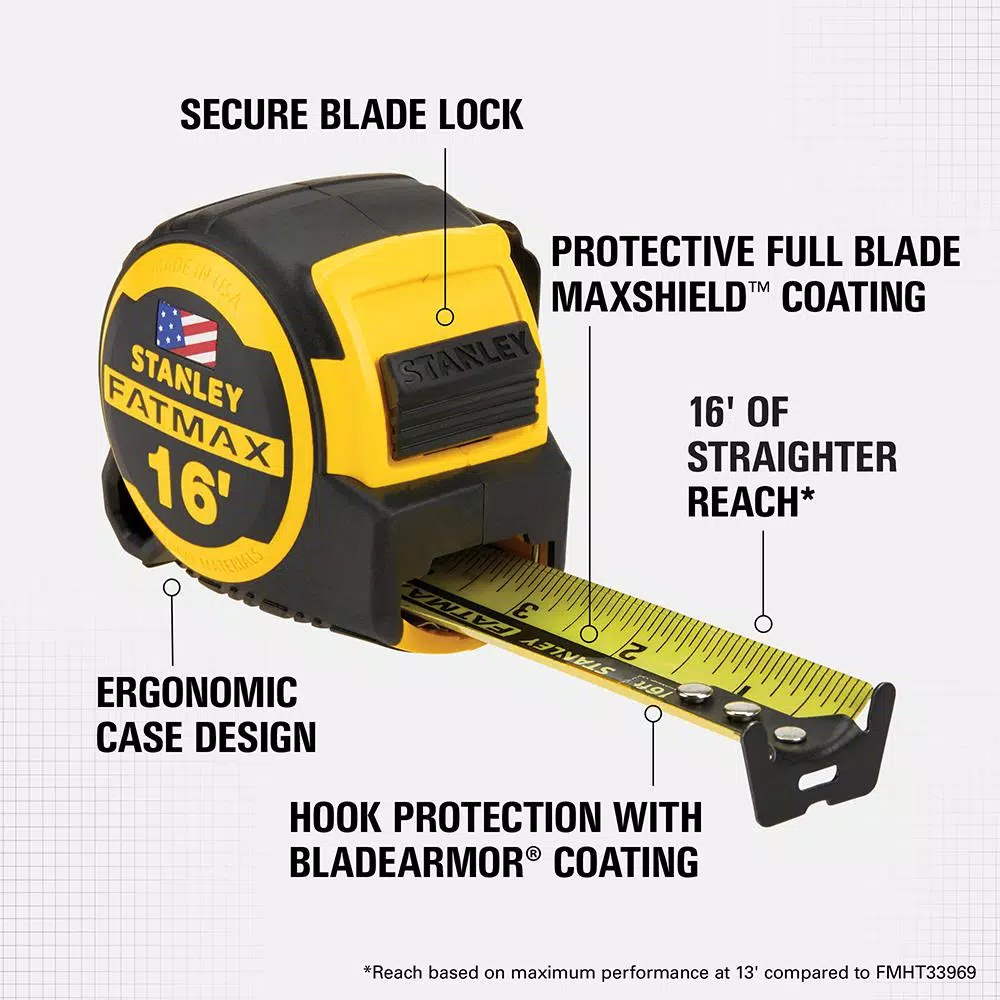 A STANLEY FATMAX® tape fits your toolbelt, your hand, and the job. It’s engineered with our patented Twin-Core™ technology for a comfortable case design, making it the most ergonomic FATMAX tape measure ever. It features 16 ft. of straighter tape reach* and our most durable MAXSHIELD™ blade coating. Get the measurement without waiting for help with a STANLEY FATMAX tape measure.